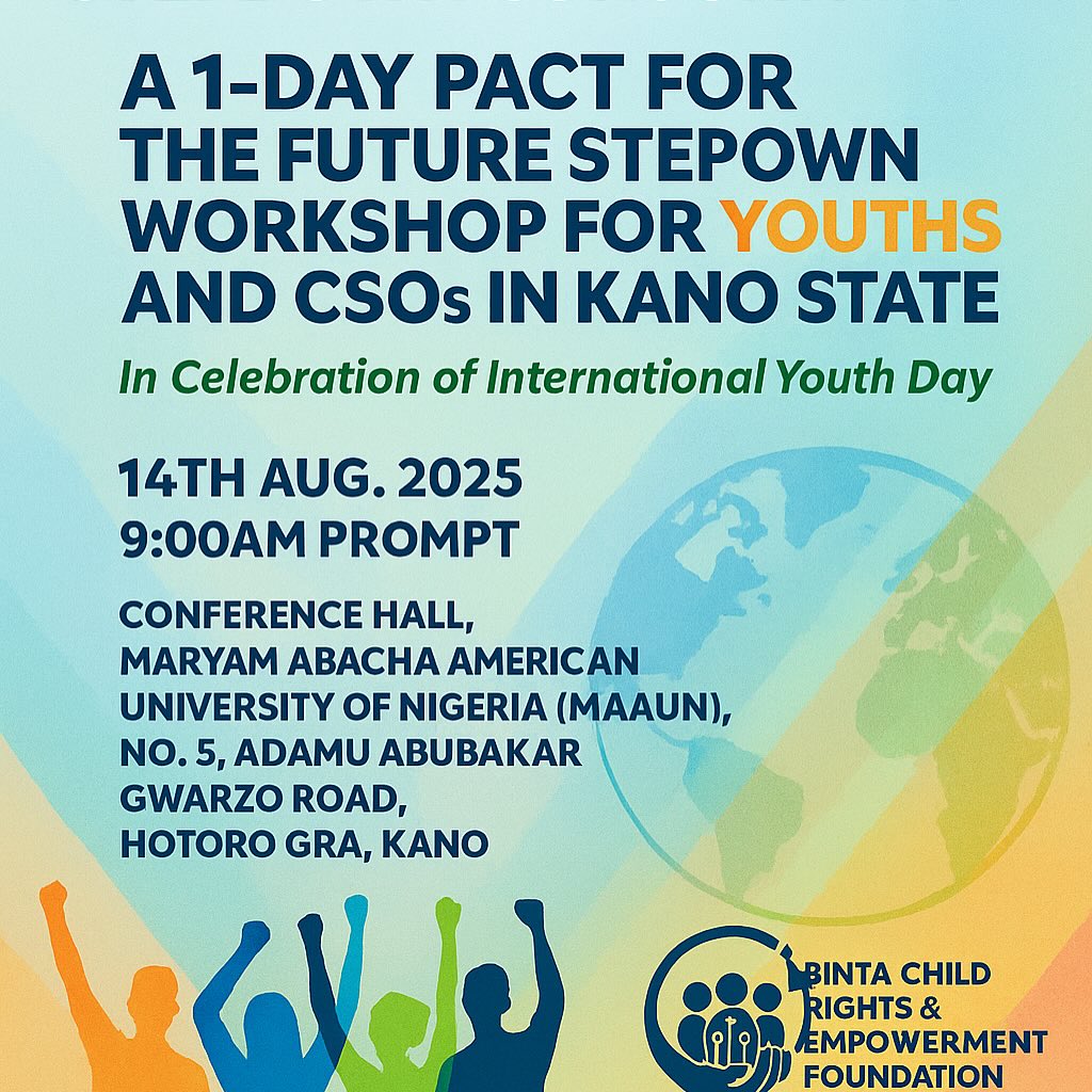 We are excited to invite you to the 1-Day Pact for the Future Step-Down Workshop — a transformational gathering for youths and CSOs in Kano State. This workshop will bring together changemakers, innovators, and leaders to chart a shared vision for a sustainable and inclusive future. Proudly organized under the United Nations Pact for the Future Step-Down Consortium with the following amazing partners: 🤝 @ebaidebheki_initiative 🤝 @dahausa_literacy_initiative 🤝 @femalejournalistsnetworkng 🤝 @gsai_africa 🤝 @mecinconsult_ltd ✨ Let’s step forward together for the future we want. #PactForTheFuture #KanoState #YouthLeadership #CSOs #FutureStepDownWorkshop #SustainableDevelopment #KanoEvents #partnershipforchange2024 #internationayouthday